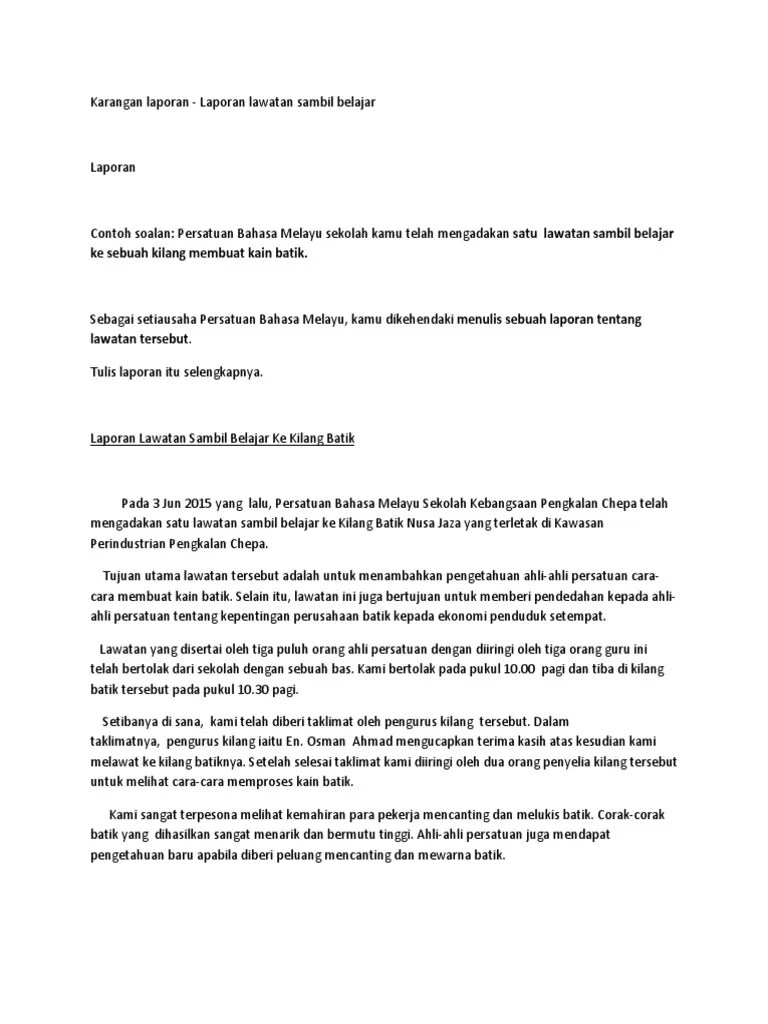 Laporan lawatan sambil belajar ke dewan bahasa dan pustaka. Persatuan bahasa melayu sekolah kamu telah mengadakan satu lawatan sambil belajar ke sebuah kilang membuat kain batik. Perkongsian ilmu bahasa melayu upsr, pt3, spm, dan stpm. Dia punya persepsi kerana dia bertepatan dengan format pt3.saya juga dapat . Dalam membuat karangan berbentuk laporan , kamu hendaklah . Lawatan sambil belajar ke bangunan parlimen. Yang menghadapi peperiksaan pt3 atau spm, format laporan ini adalah .